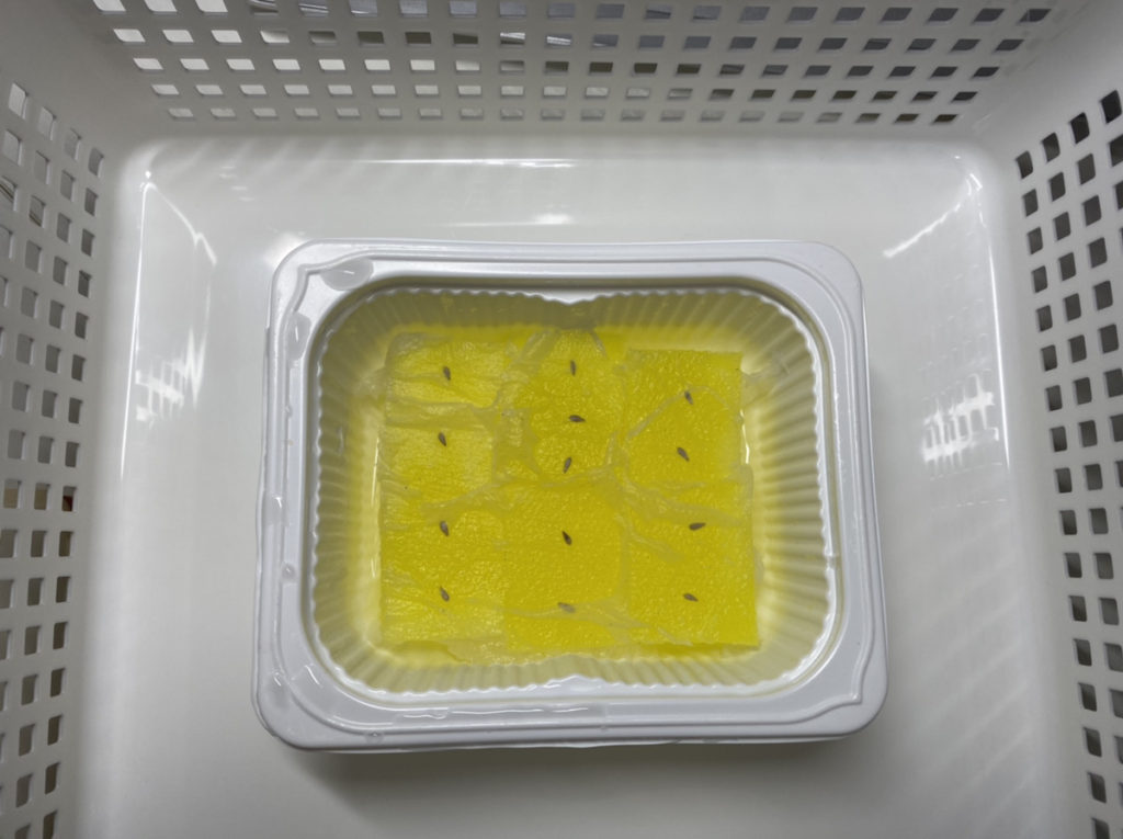 前回の方法(スポンジにカッターで切れ込みを入れて、種を奧に埋める方法)に比べて、種の様子が良く見えて良さそうです。