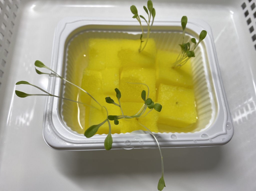 よく水になじませたスポンジ培地の上に種をのせてティッシュペーパーで覆う方法に変えました。